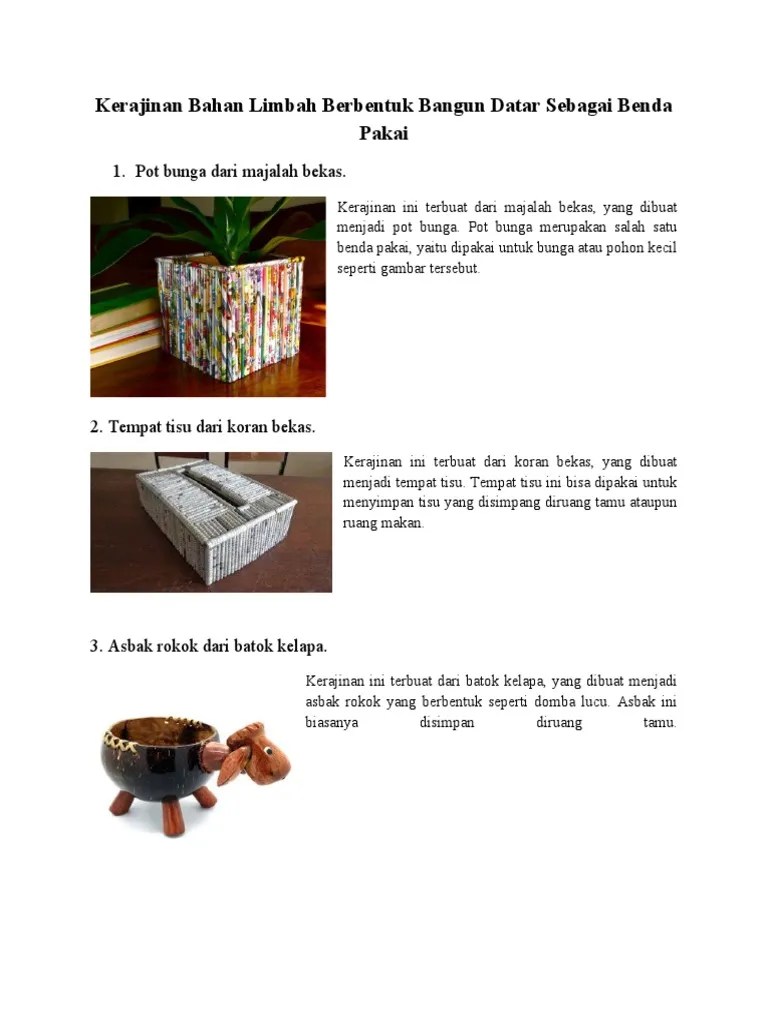 Kerajinan dari bahan limbah berbentuk bangun datar jenis dan karakteristik ke r ajinan dari b ahan limbah b e r b e n tuk b angun d a tar s . Aneka produk kerajinan dari bahan limbah berbe ntukbangun datar 1. Pengertian kerajinan limbah berbentuk bangun datar, mengidentifikasi aneka produk kerajinan dari bahan limbah berbentuk bangun datar, . Click ppt bab 1 kls xi.pptx link . Kerajinan limbah berbentuk bangun ruang adalah suatu produk kerajinan yang diproduksi dengan memanfaatkan bahan limbah berbentuk bangun .